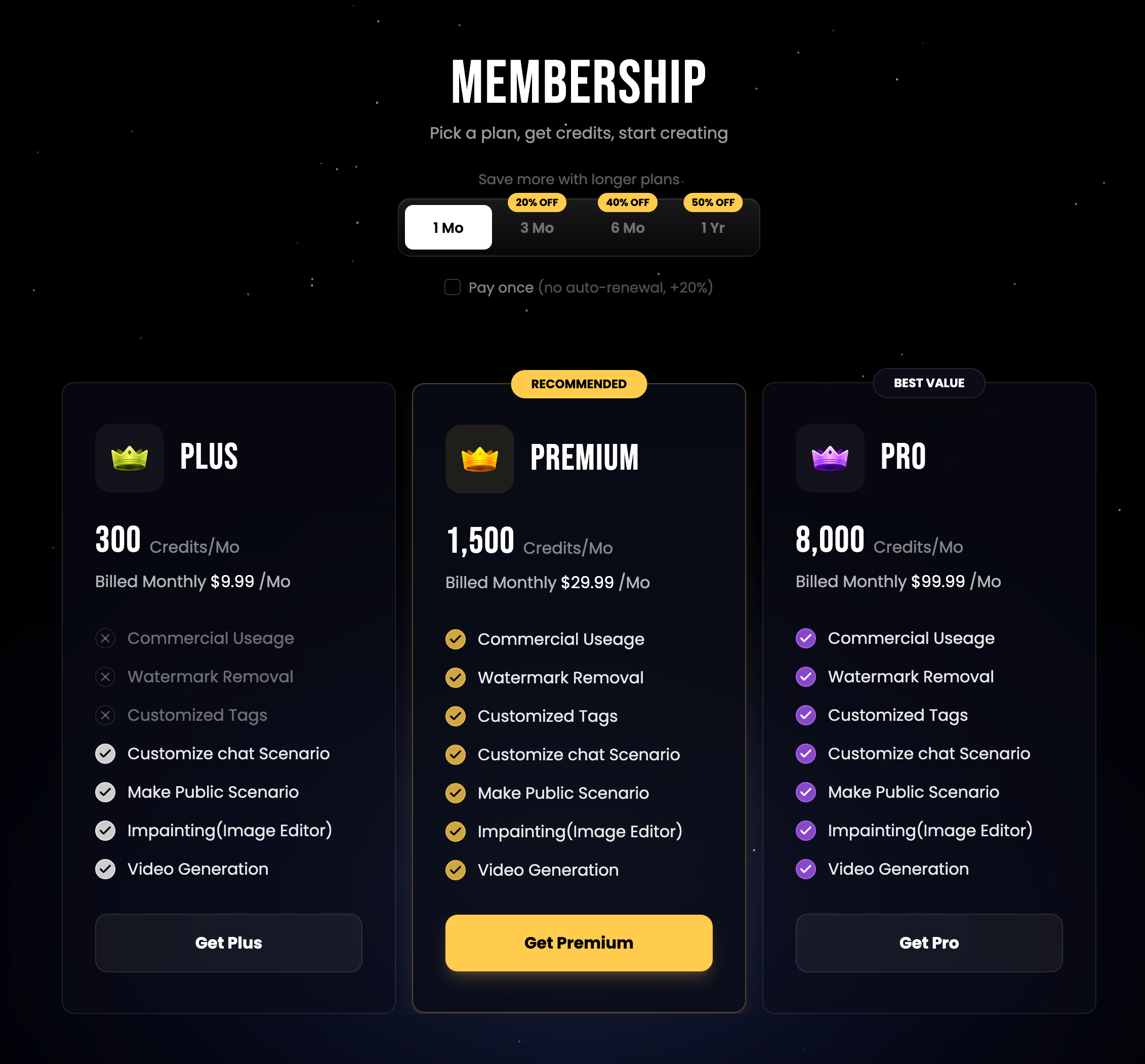 - One-time Subscription: Single purchase, no need to cancel. Does not auto-renew for the next cycle. Longer duration purchases have larger discounts.